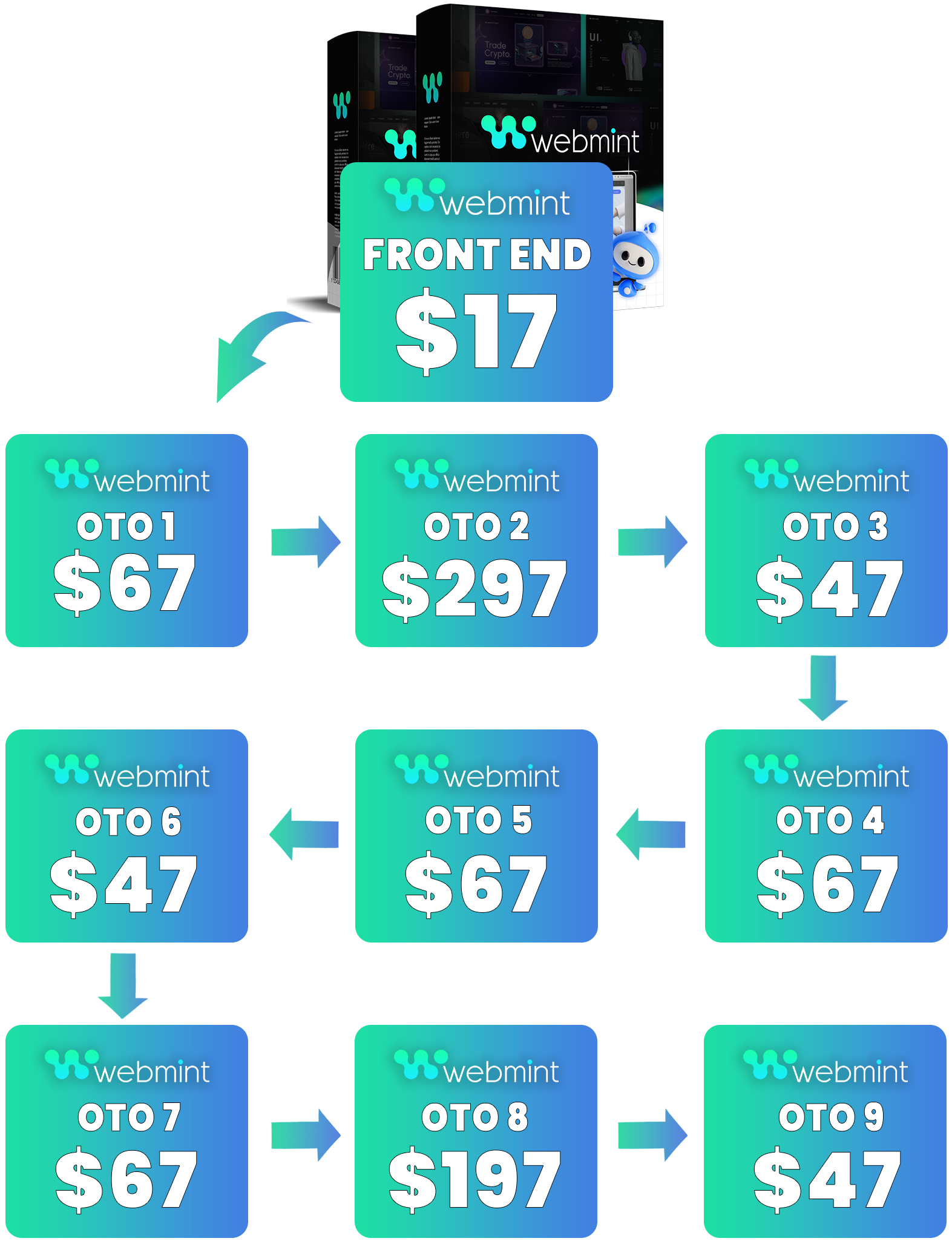 WebMint’s AI Super Programmer™ builds multi-step funnels with upsells, downsells, and thank-you pages in seconds.